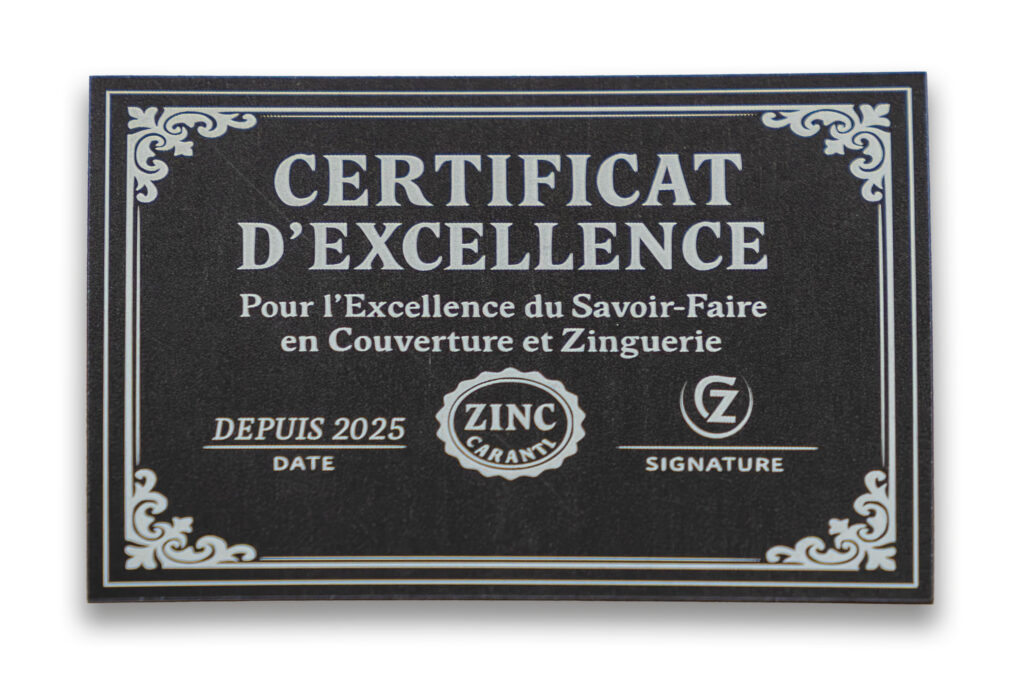Le Certificat d’Excellence du Graveur Zingueur est une preuve tangible de votre savoir-faire sur vos chantiers.Gravé avec précision, il atteste d’un travail réalisé dans les règles de l’art